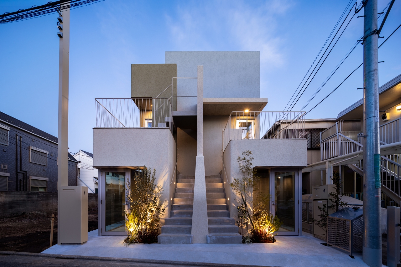 間口の狭さをポジティブに変換すべく京町家のように間口に対して奥行きの全てが容積となるような重層長屋の提案を行った。上階への個別アクセスのプランニング及びメゾネットの有り様が素直に外観の形態となっている。
