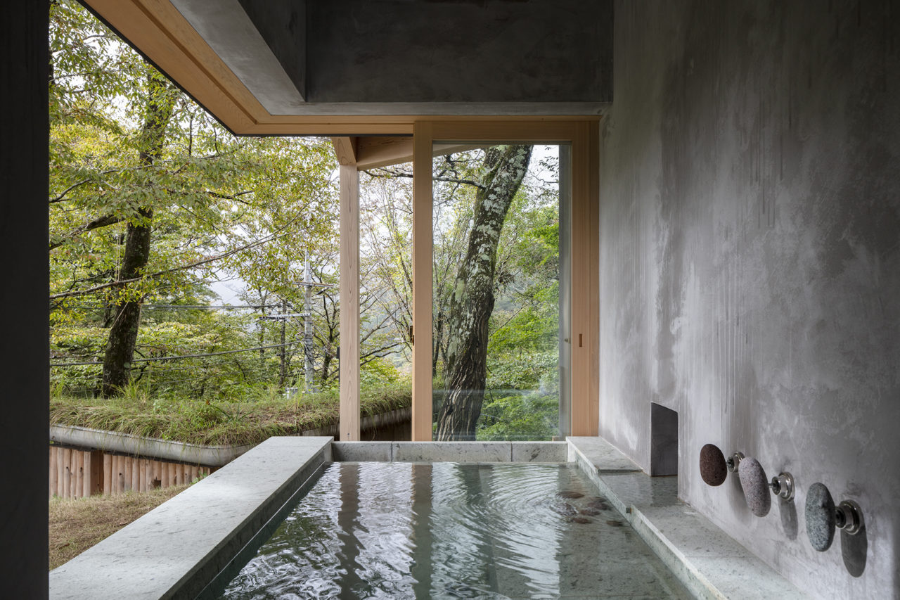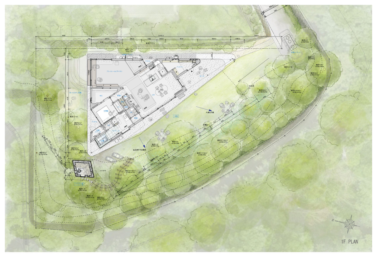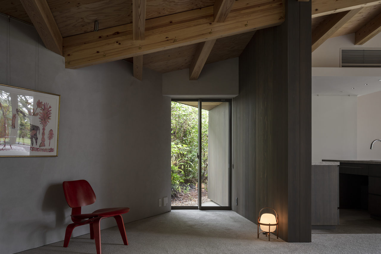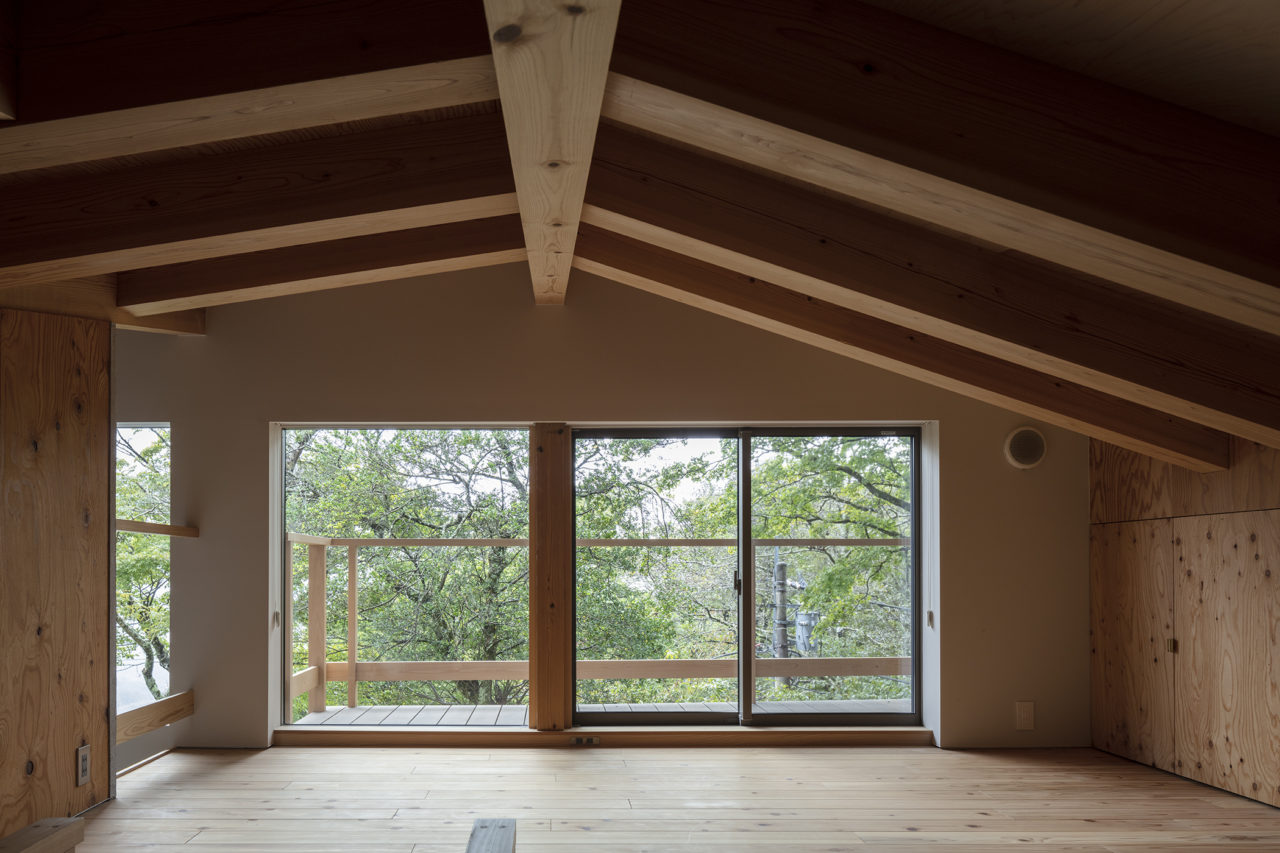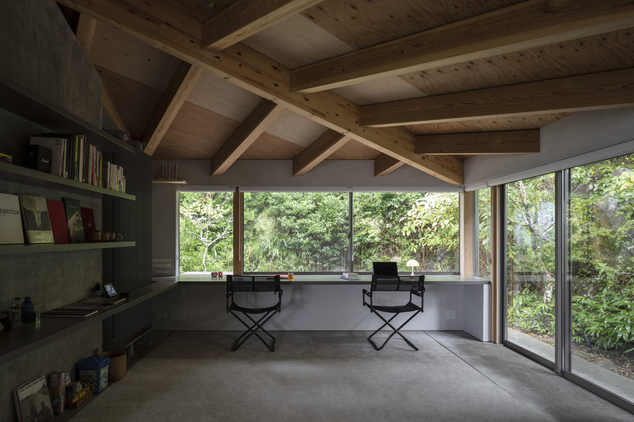 羽先の一方は玄関アプローチのためのポーチ、他方は休息の象徴たる半露天風呂やサウナ小屋が接続するようなかたちである。羽を広げた両端を繋ぐ長辺25mは前庭に対峙し、遠望する景観を取り込み、将来ビリヤード台を設置する予定のプレイルームまで光を届けると共に、大きなヤマモミジの緑陰をインテリアにも落とす。三角形平面により導き出された各所の開口部周りは、アルコーブと共に内外が一体化される効果を生んでいる。