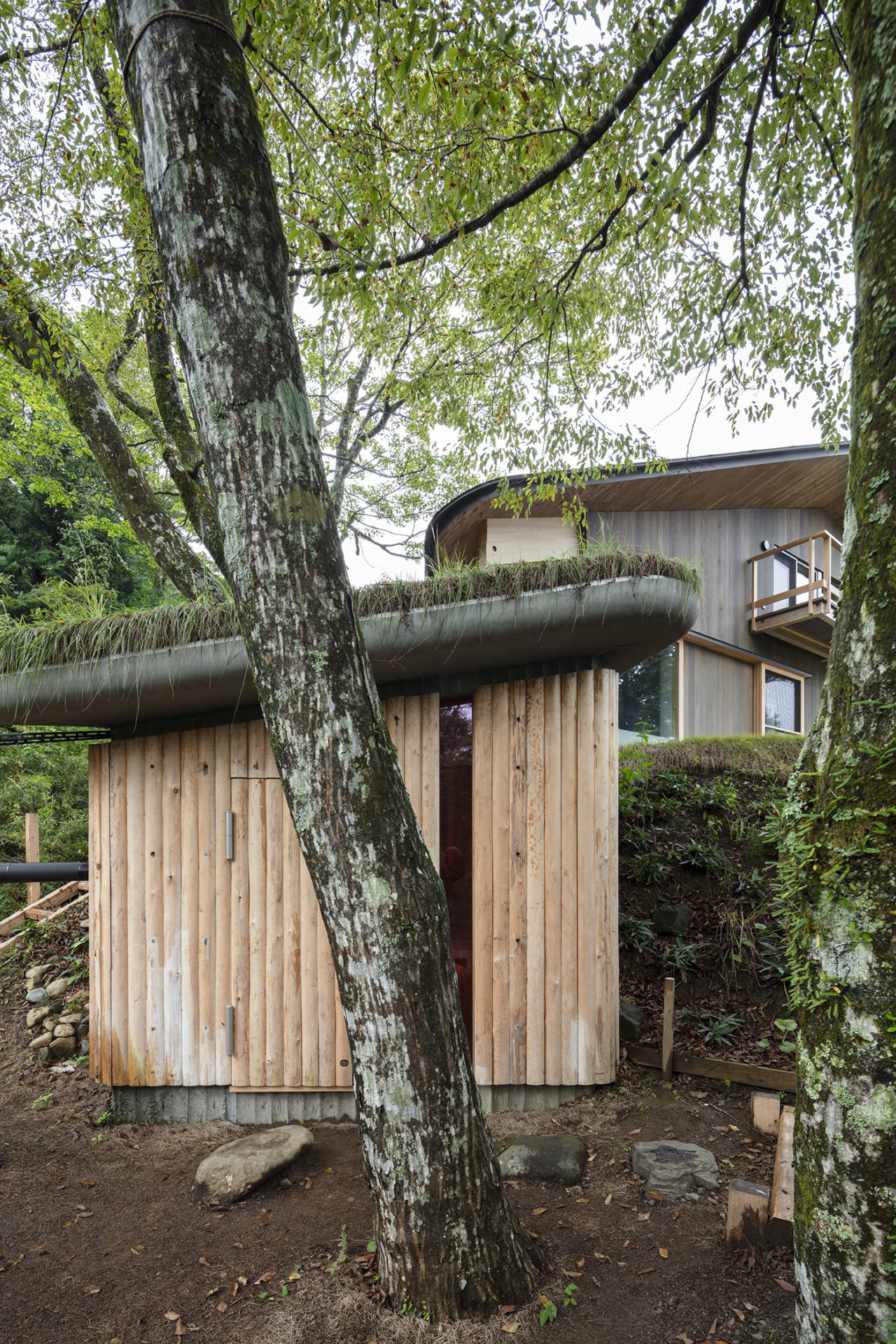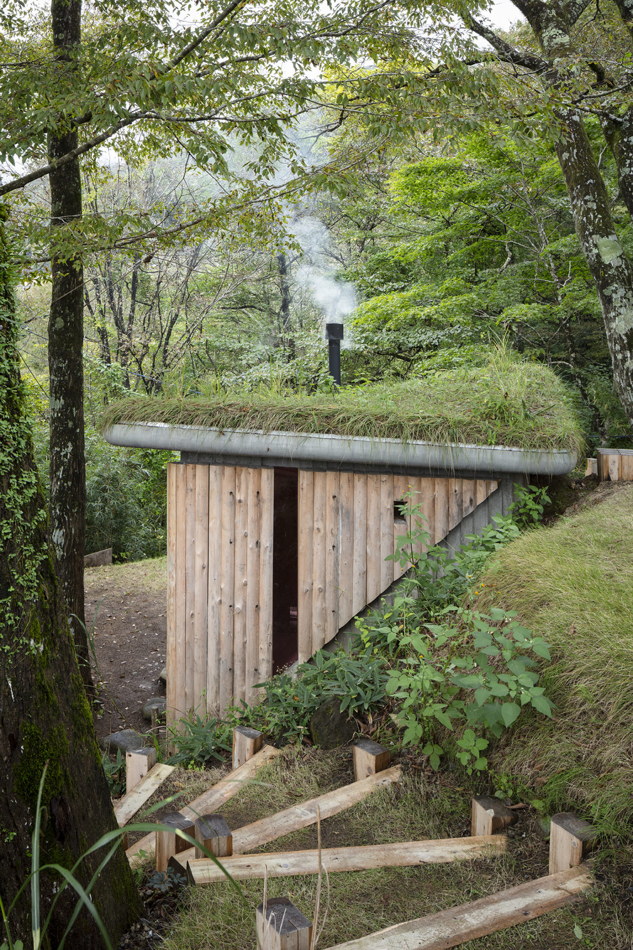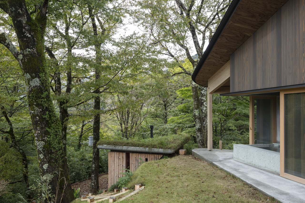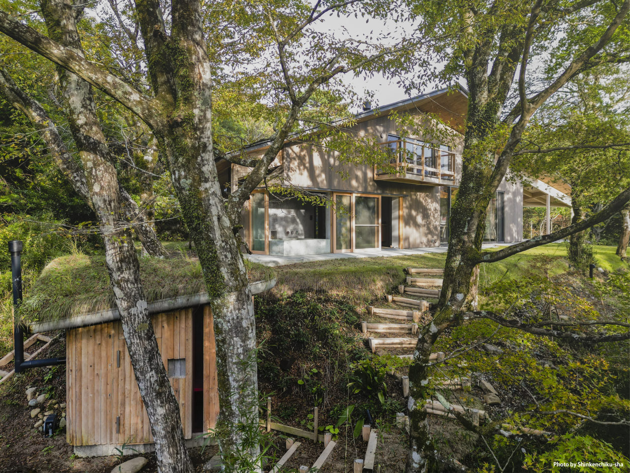 屋根は草屋根とし、湿った空気や樹木の匂いと溶け合うスケール感をもたせた。