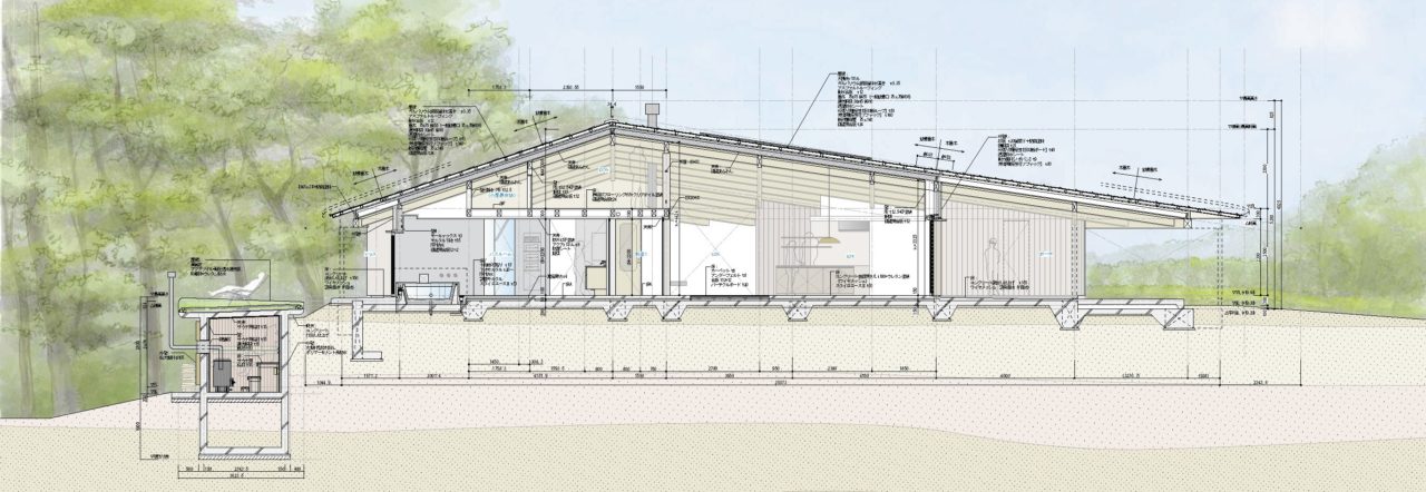 一方で建主は、この地を休息の場として選び、ゆっくりと自然環境と親しみつつ、暮らしに使うエネルギーに対す自身の考えをデザインする実験場にしたいという考えがあった。建主と共に構築した、住宅と人間の対話を生む、蓄電残量エネルギーが暮らしの電力を制御するインタラクティブデザイン(グリーン誘導型パワーマネジメントシステム)は、雷の落ちた停電の夜に蝋燭で過ごした子供心の記憶のように、建築と人間を近しいものとして感じさせてくれる。