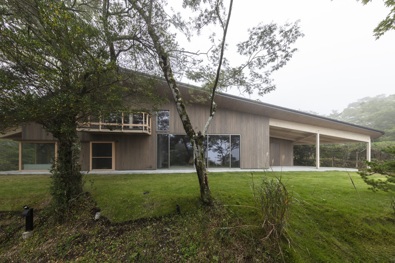 大涌谷の赤茶けた山肌と揺らぐ噴煙、裾野には揺らぐススキ野原。ゆらゆらと霧が立ち込めそれらの景色を隠し雲に浮いているような感覚にもなる。敷地には尾根伝いにアプローチする車道のほかに山下までまっすぐに切り通された人道があった。その切り通しを抜ける風を感じ、この流れを大切にする設計を目指すことにした。そこで三角形の敷地にフィットし、気のいい風が庭に吹込む平面形を想像し、そこへ鳥が羽を休めたような切妻屋根を架けた。結果として降り立った建築は崖下からは見えず、身を隠すような格好となった。