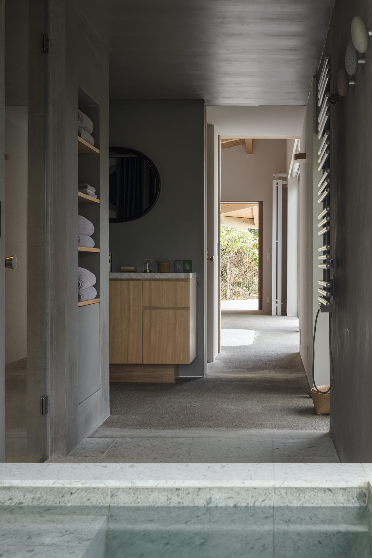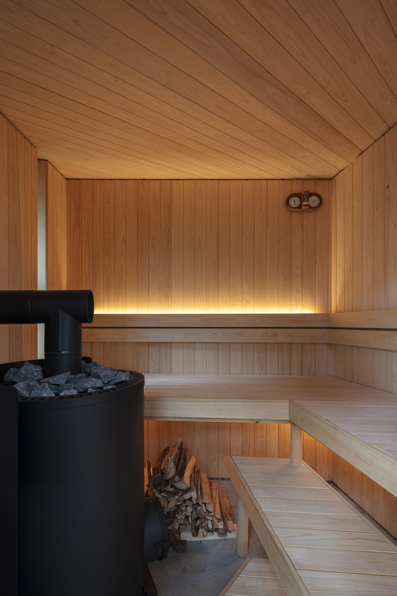 サウナの外壁は間伐材のヒノキ太鼓材を型枠として、コンクリートを打ち込み残置している。