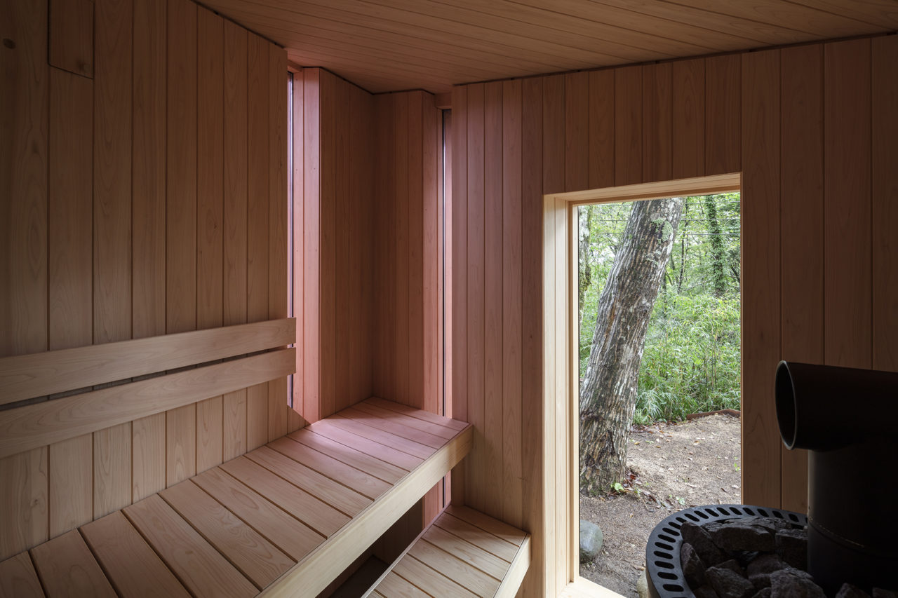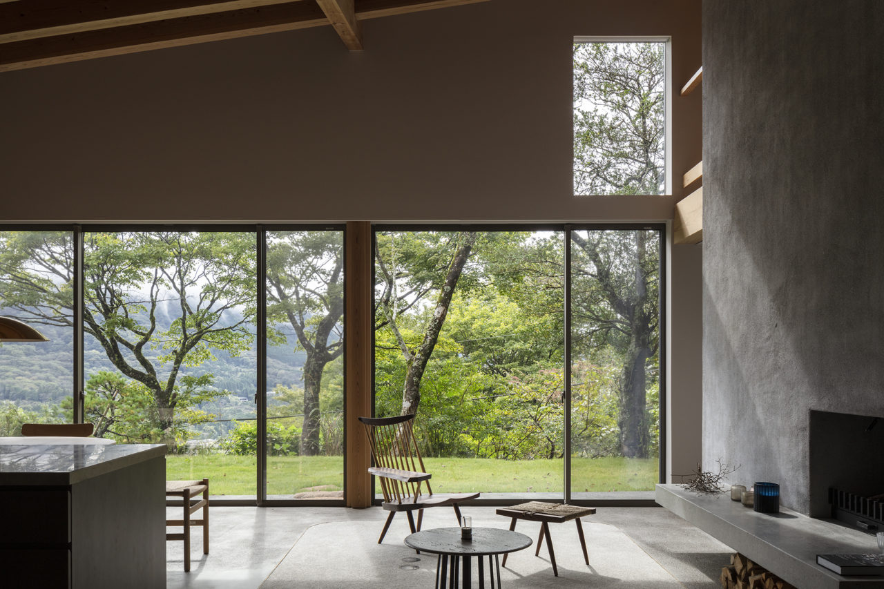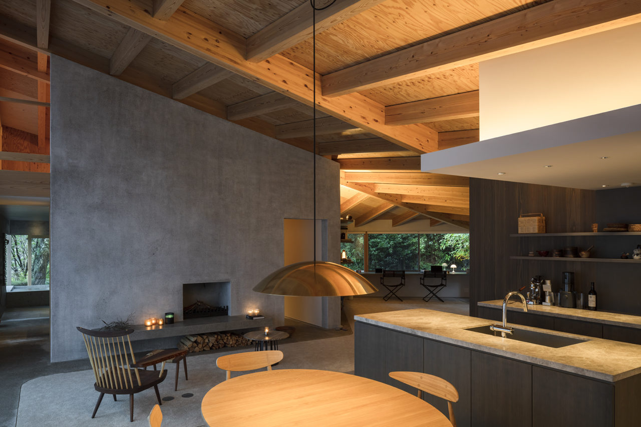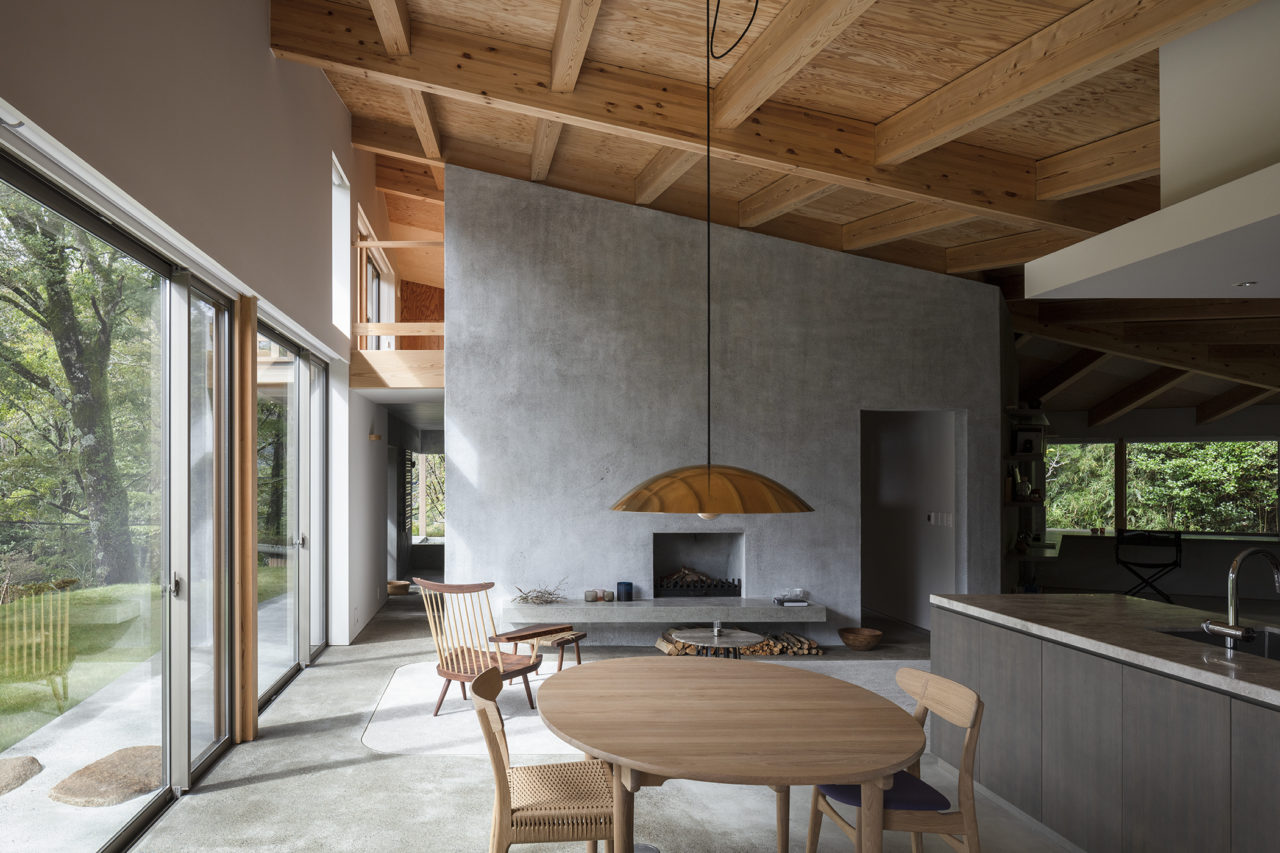 スギ板とモールテックスを用いた静かな素材構成が、森の緑を受け止める背景になっている。