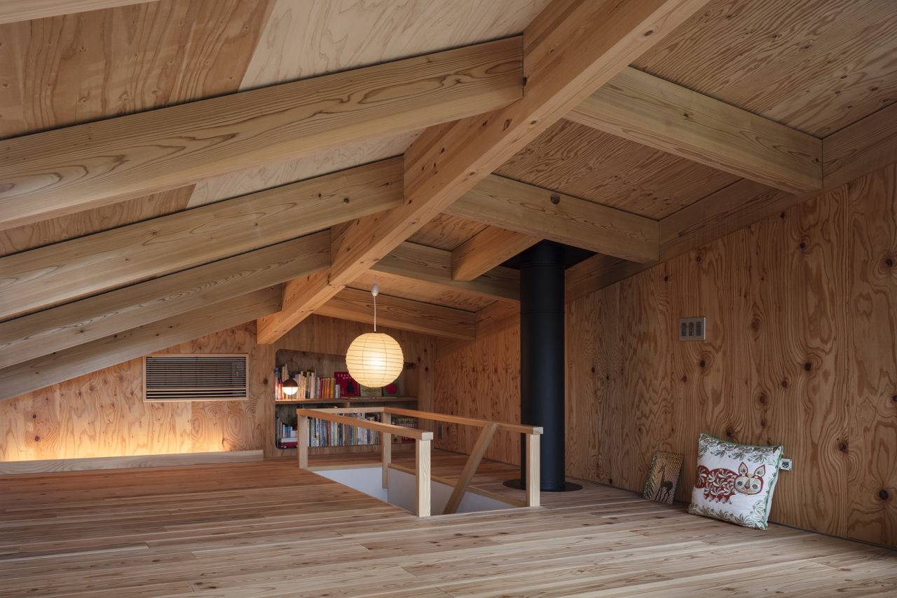 そんな緩やかな思考とふわふわとした自然環境に包まれながら優しい時間を過ごすべく、敷き込まれた絨毯は前面の芝生の庭と呼応するように大屋根の下の干し草のベッドのようでもあり、木質系高断熱材と輻射熱空調の効果もあって親鳥の優しい羽毛の中で休まるひなのような感覚になる。エネルギーマネジメントの作法と同様に、家具によって居方を規定されることがない場所となった。